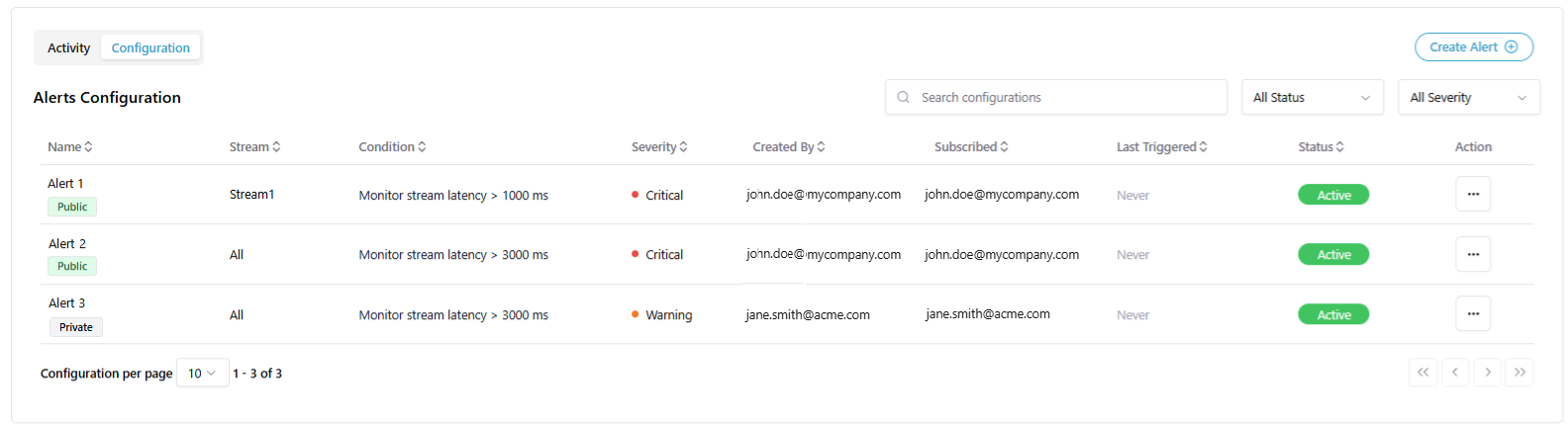 - Detailed view: Displays the severity of alerts along with their activity and configuration details.